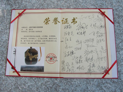 琴體采用蘇州傳統(tǒng)蟲(chóng)膠擦漆工藝,手工拋光打磨,可清晰顯露出紫檀木細(xì)密的毛孔,整琴制作精致細(xì)膩,演奏手感非常舒適,上下?lián)Q把輕松自如,有利演奏技巧的發(fā)揮